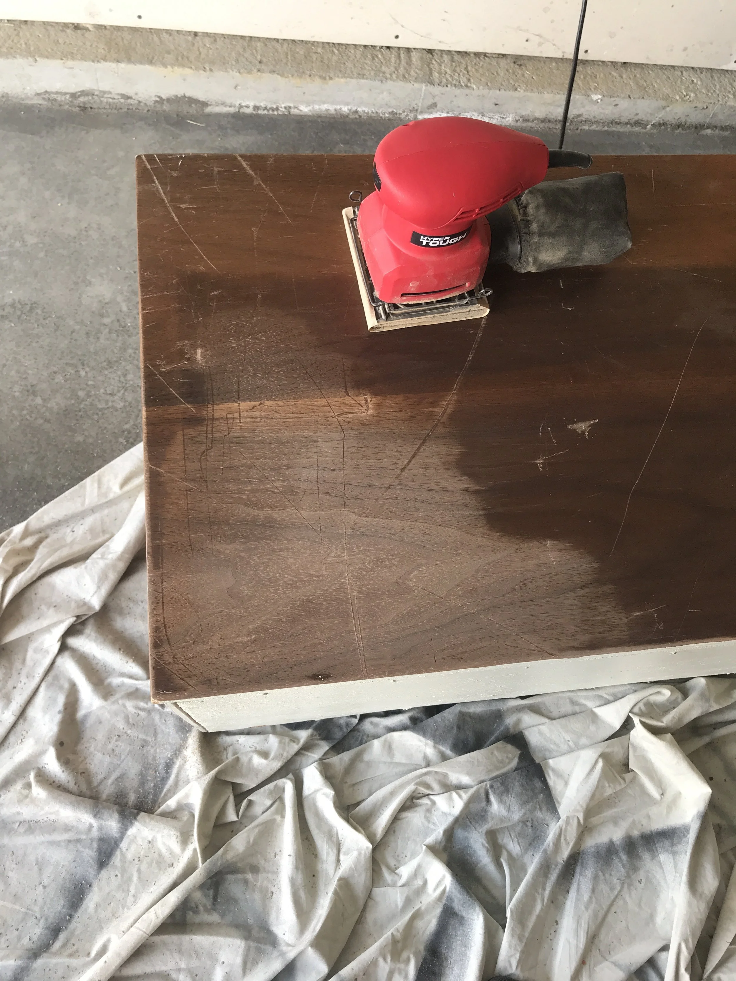 After two trips to transfer it to my moms garage, I was ready to get working on it! I decided I wanted to start with sanding the bottom piece because it looked “easiest” and I was excited to see the scratches erased from the top. I removed the legs, took off the doors, pulled out the drawers, and wiped down every corner and was ready to see the transformation.