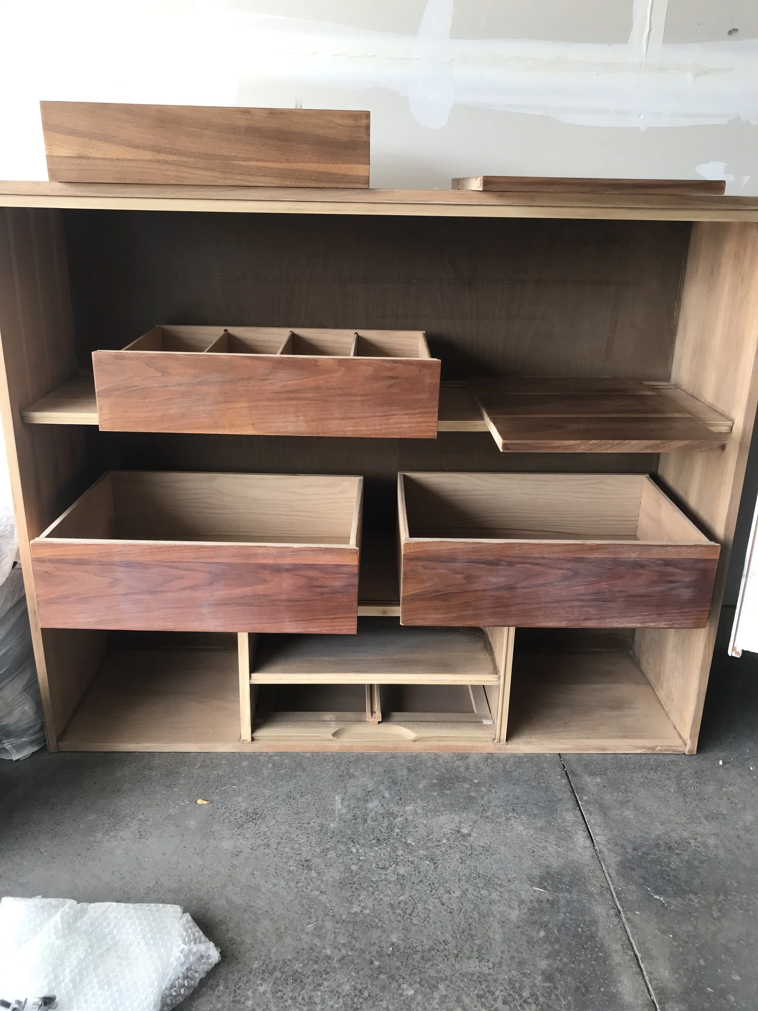 The process of applying the polyurethane clear matte finish to the drawer fronts. Top left drawer was done first. Bottom right was the last one to get applied.