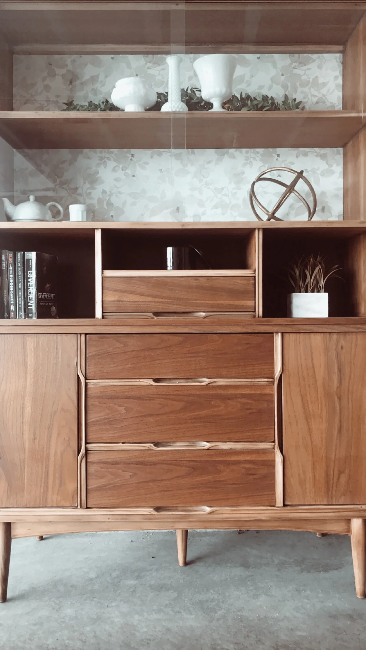 One night during my regular scrolls through marketplace, this 1950s hutch caught my eye. I loved the walnut wood grain, the mid century modern elements from the leg shape to the details around the drawers and doors. After just a few moments, I could visualize how it would look after some simple sanding, staining, and a new design element to really make it pop.